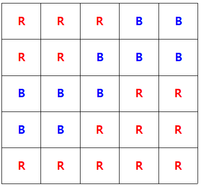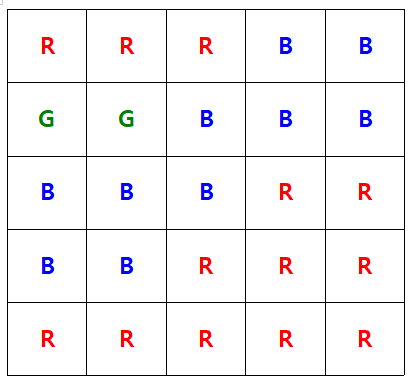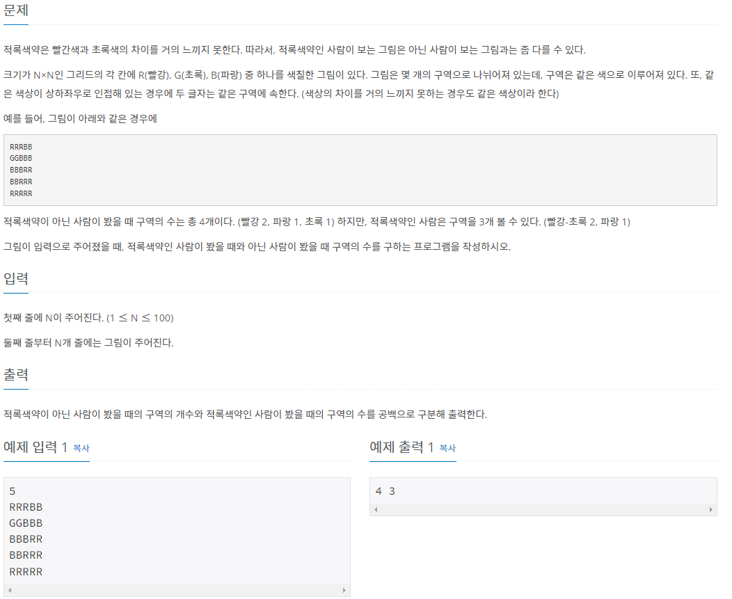 적록색약은 빨간색과 초록색의 차이를 거의 느끼지 못한다. 따라서, 적록색약인 사람이 보는 그림은 아닌 사람이 보는 그림과는 좀 다를 수 있다. 크기가 N×N인 그리드의 각 칸에 R(빨강), G(초록)