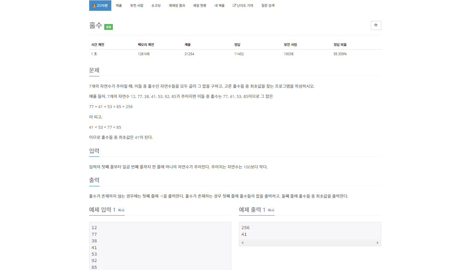 백준 2576번 홀수는 브론즈 3 난이도의 수학 문제이다. 이 문제에서는 7개의 자연수가 주어지고 이들 중 홀수인 자연수들을 모두 골라 그 합을 구하고, 고른 홀수들 중 최솟값을 찾으면 된다.