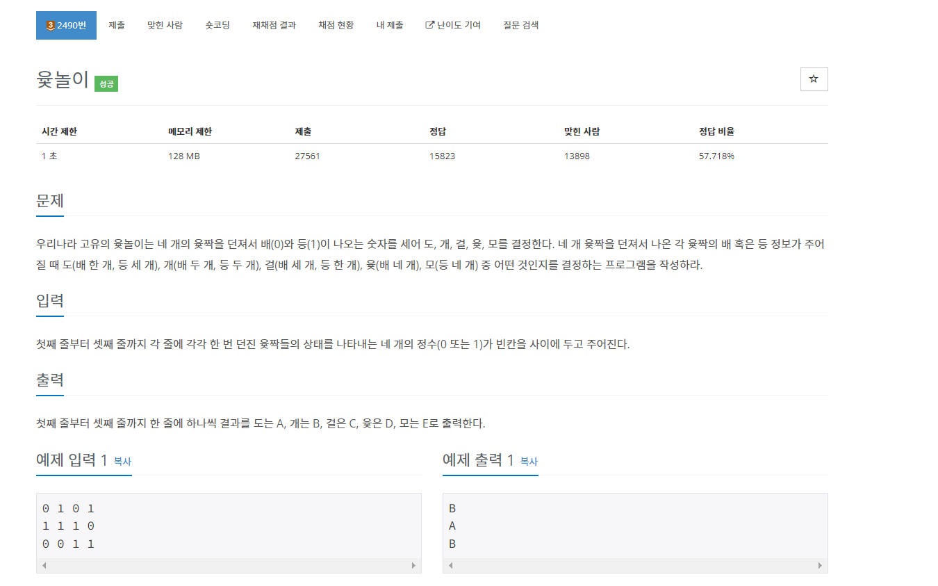 백준 2490번 윷놀이는 브론즈 3 난이도의 구현 문제이다. 이 문제에서는 3줄의 입력이 주어지는데 한 줄마다 4개의 수가 주어진다. 0은 배를 뜻하고 1은 등을 뜻한다. 그리고 이게 어떤 윷짝인지를 출력하면 된다.