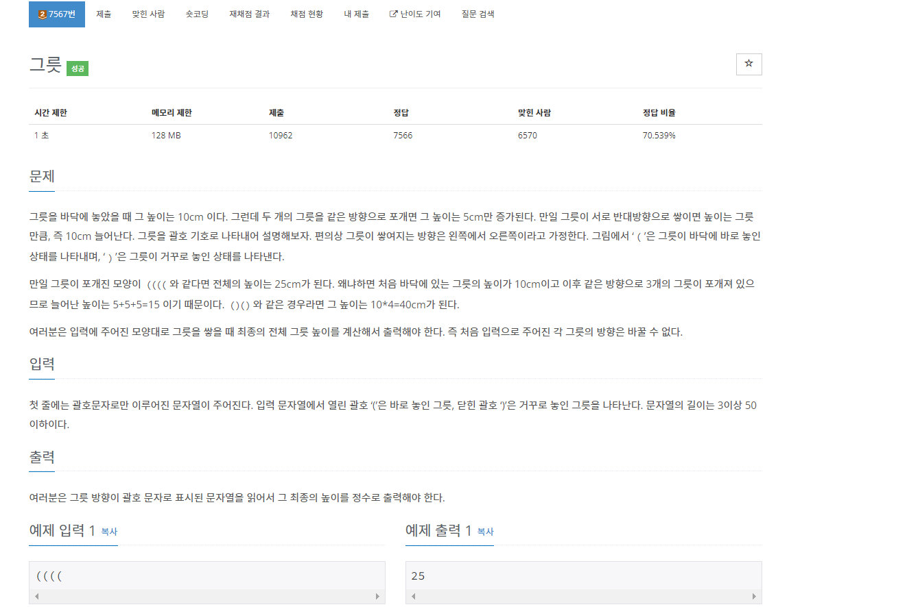 백준 7567번 그릇은 브론즈 2 난이도의 구현 및 문자열 문제이다. 이 문제는 그리고 한국 정보올림피아드 2013 초등부에 나왔던 문제이기도 하다. 이 문제에서는 '('와 ')'로만 이루어진 문자열이 주어진다. 이거는 그릇을 뜻하는 문자열이고 이 그릇의 높이를 계산해서 구하면 된다.