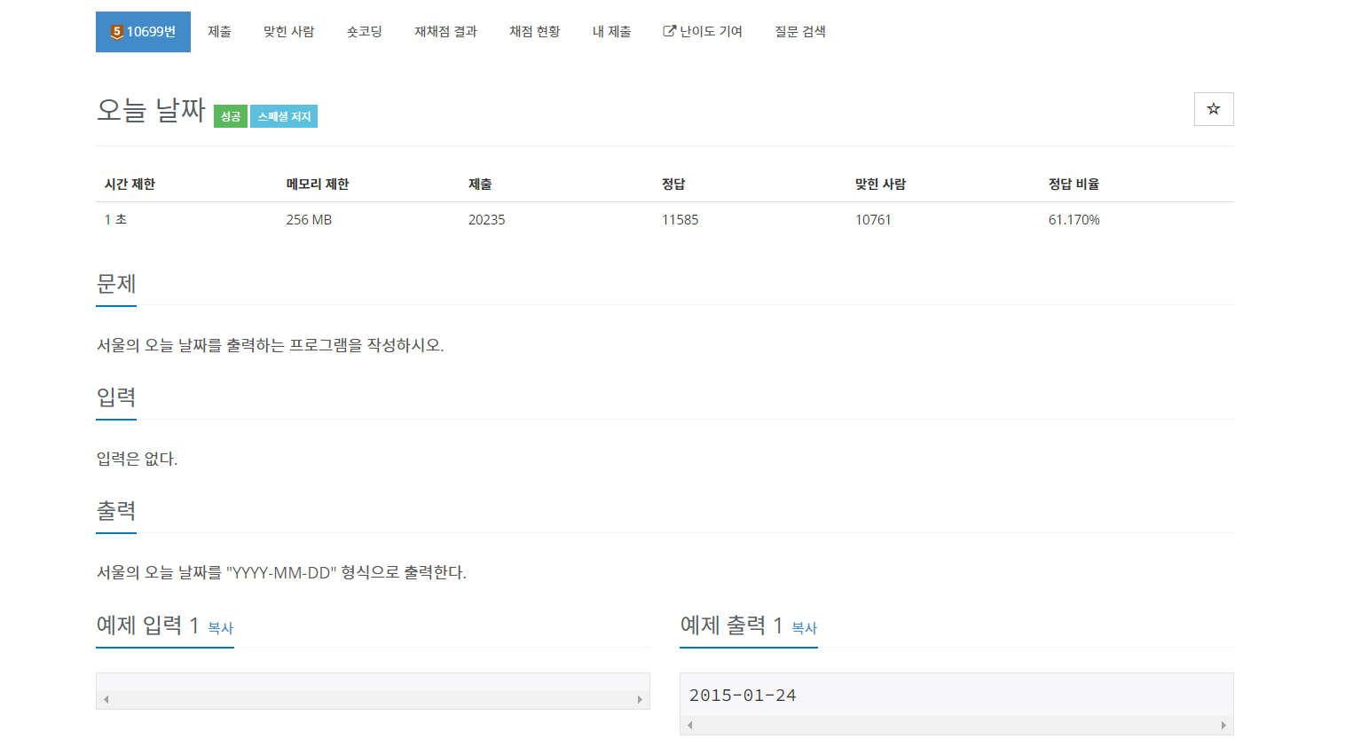 백준 10699번 오늘 날짜는 브론즈 5 난이도의 구현 문제이다. 이 문제는 되게 간단한 문제이고 이 문제보다 더 쉬운 문제가 있나 싶을 정도이다.