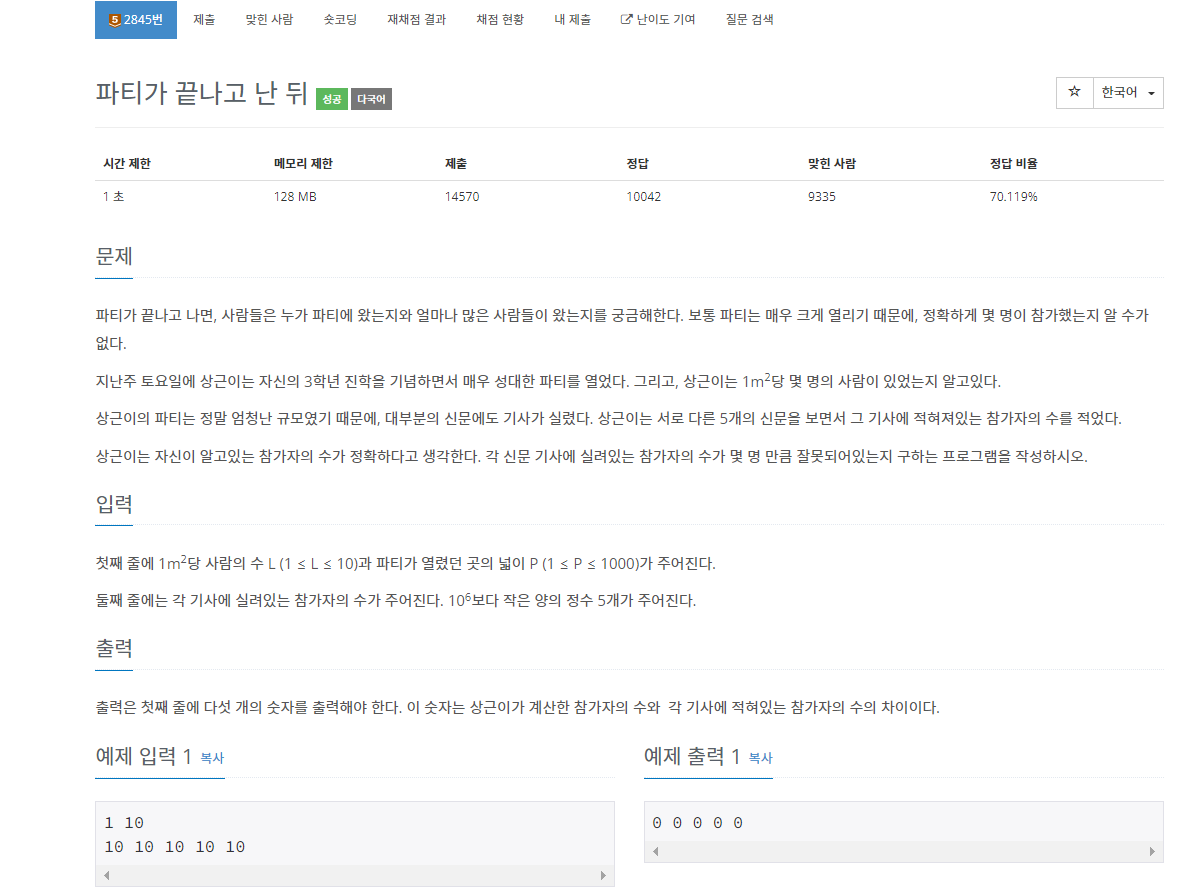 백준 2845번 파티가 끝나고 난 뒤는 브론즈 5 난이도의 수학 및 구현 문제이다. 이 문제에서는 1m^2당 사람의 수, 넓이, 그리고 각 기사에 실려있는 사람의 수 5개가 주어진다. 이때 계산된 사람의 수와 각 기사에 적혀있는 사람의 수의 차이를 구하면 된다.