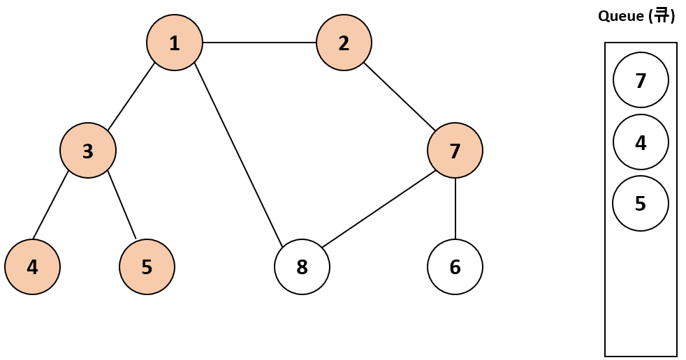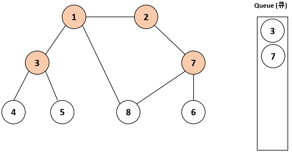 마찬가지로 2번 노드를 큐에서 제거하고 2의 방문하지 않은 인접 노드를 큐에 넣고 방문 처리한다. 즉, 7번 노드를 큐에 넣는다.