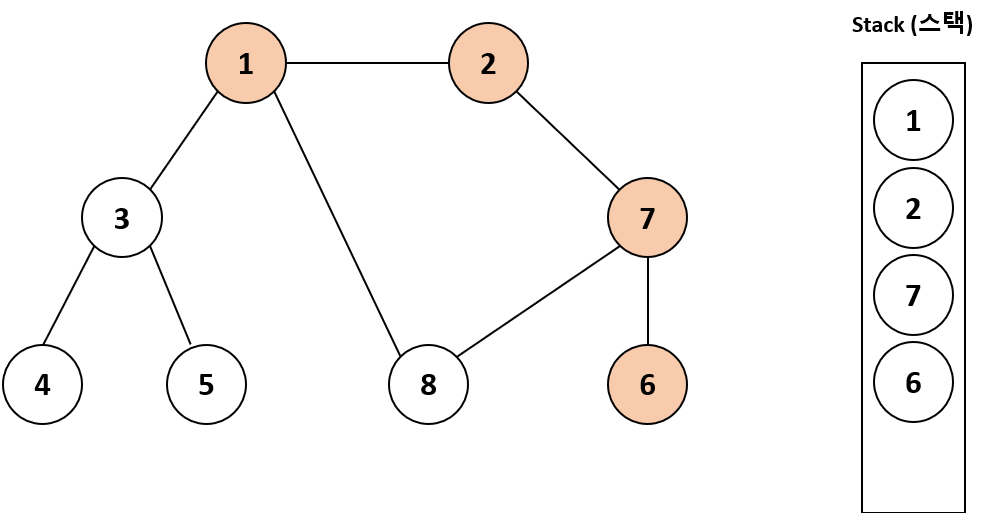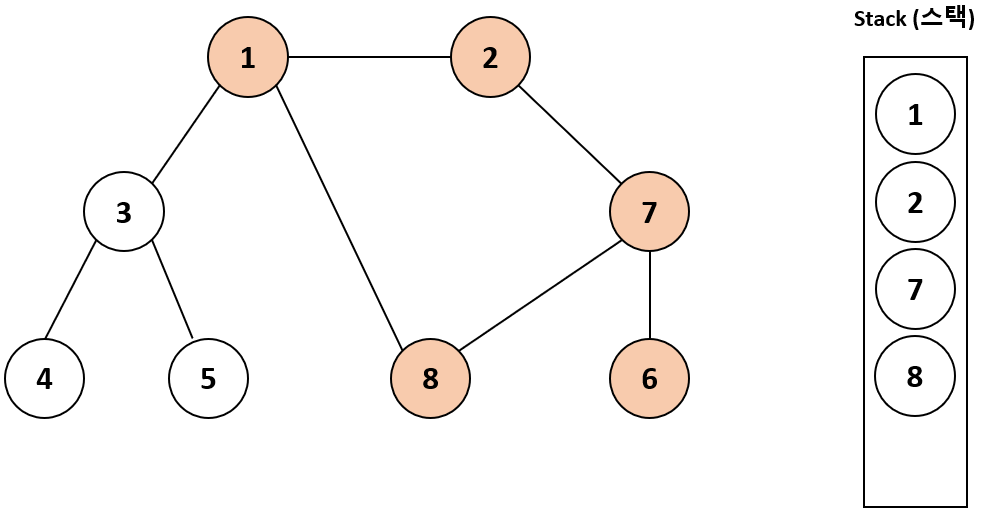 스택에서 가장 최근에 추가된 7의 방문하지 않은 인접 노드인 8을 스택에 넣고 방문 처리한다.