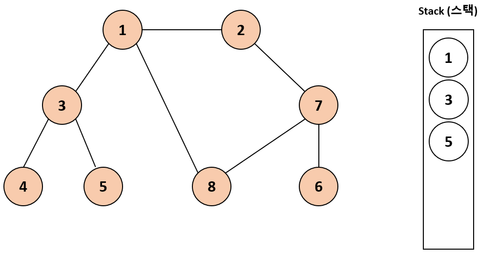 스택 최상단에 있는 3의 인접 노드인 5를 아직 방문하지 않았으므로 5를 스택에 넣고 방문 처리한다.