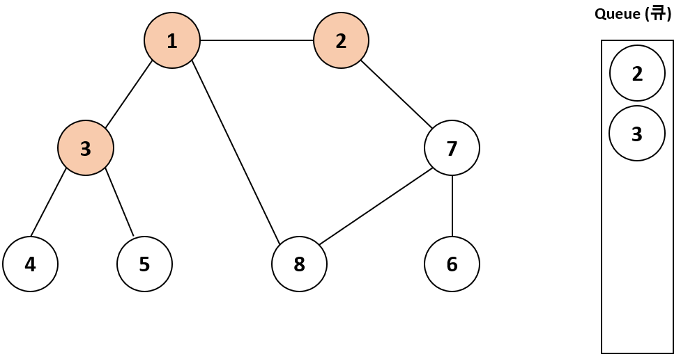 먼저 1번 노드를 방문 처리하고 큐에 넣었다. 그다음에 큐에서 노드를 꺼내 방문하지 않은 모든 인접 노드를 큐에 삽입하고 방문 처리를 한다. 즉, 2번 노드와 3번 노드를 큐에 넣고 방문 처리를 한다.