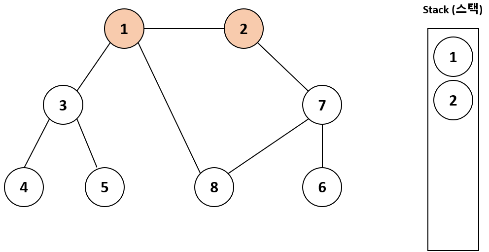 1을 스택에 넣은 다음 아직 방문하지 않은 인접 노드인 2를 스택에 넣고 방문 처리한다.