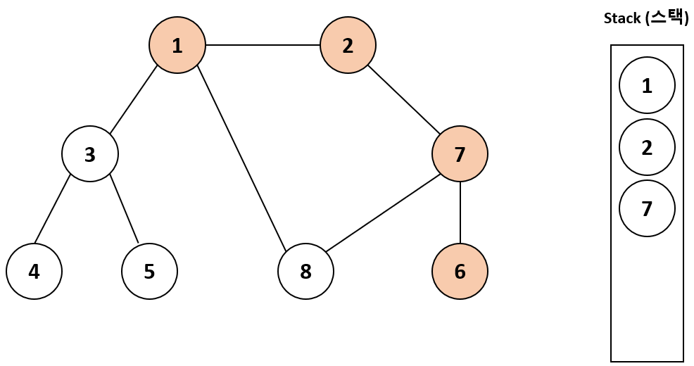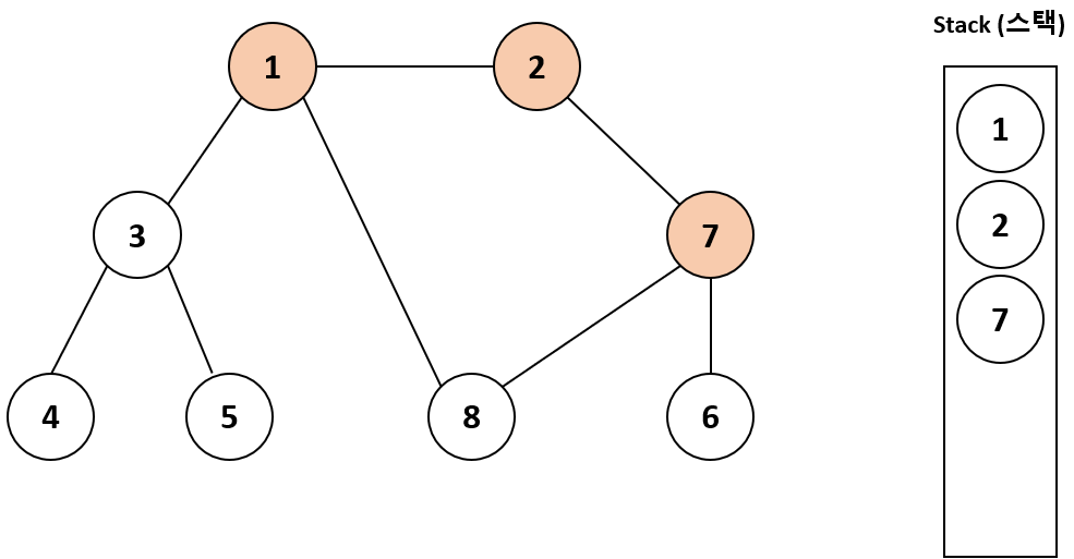 2를 스택에 넣은 다음에 인접 노드인 7을 방문하지 않았으므로 7을 스택에 넣고 방문 처리한다.