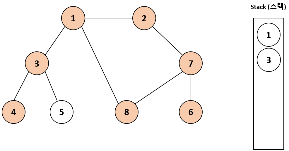 스택 최상단 노드인 1중에서 3을 아직 방문하지 않았으므로 3을 스택에 넣고 방문 처리해준다.