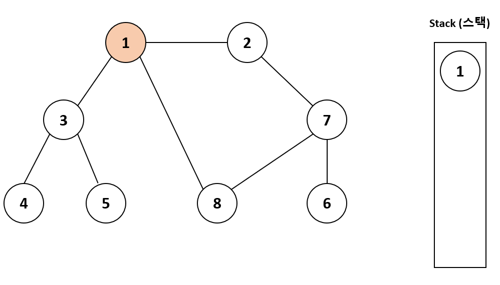 우선 탐색 시작 노드인 1번 노드를 스택에 삽입하고, 방문 처리한다.