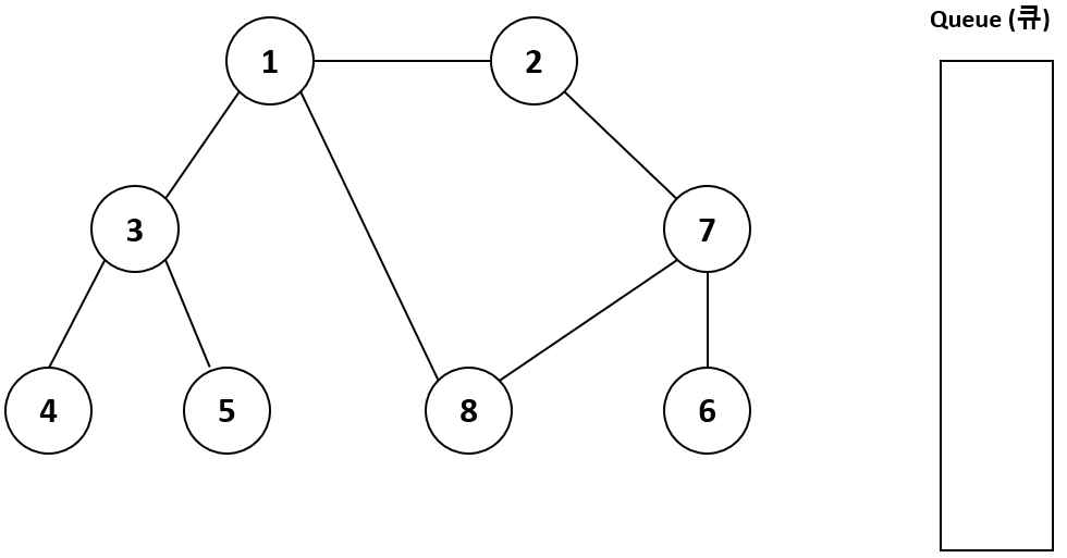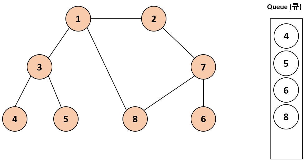 큐 맨 위에 있는 7을 제거하고 방문하지 않은 인접 노드들을 (6, 8번 노드) 큐에 넣고 방문 처리한다.