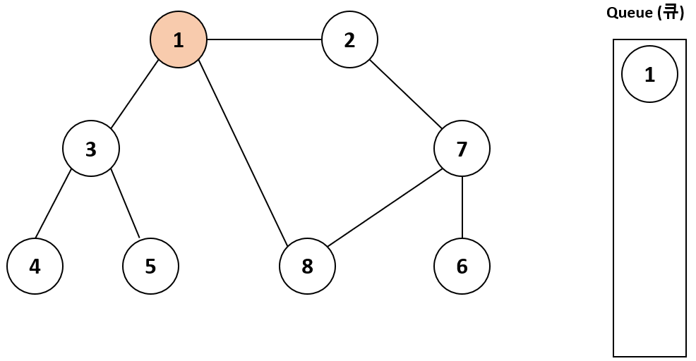 우선 탐색 시작 노드를 큐에 삽입하고 방문 처리한다.