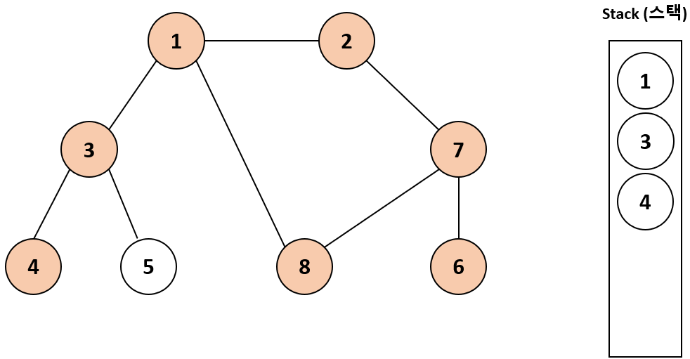 3의 인접 노드인 4를 아직 방문하지 않았으므로 4도 마찬가지로 스택에 추가하고 방문 처리한다.