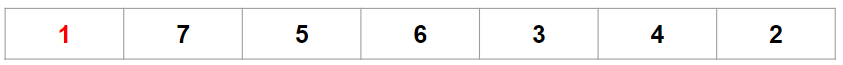 이 예시에는 1부터 7까지의 숫자들이 있다. 우선 첫 번째 인덱스부터 마지막 인덱스까지에서 최솟값을 찾는다. 최솟값은 1인데 맨 앞자리가 1이므로 변화 없이 간다.
