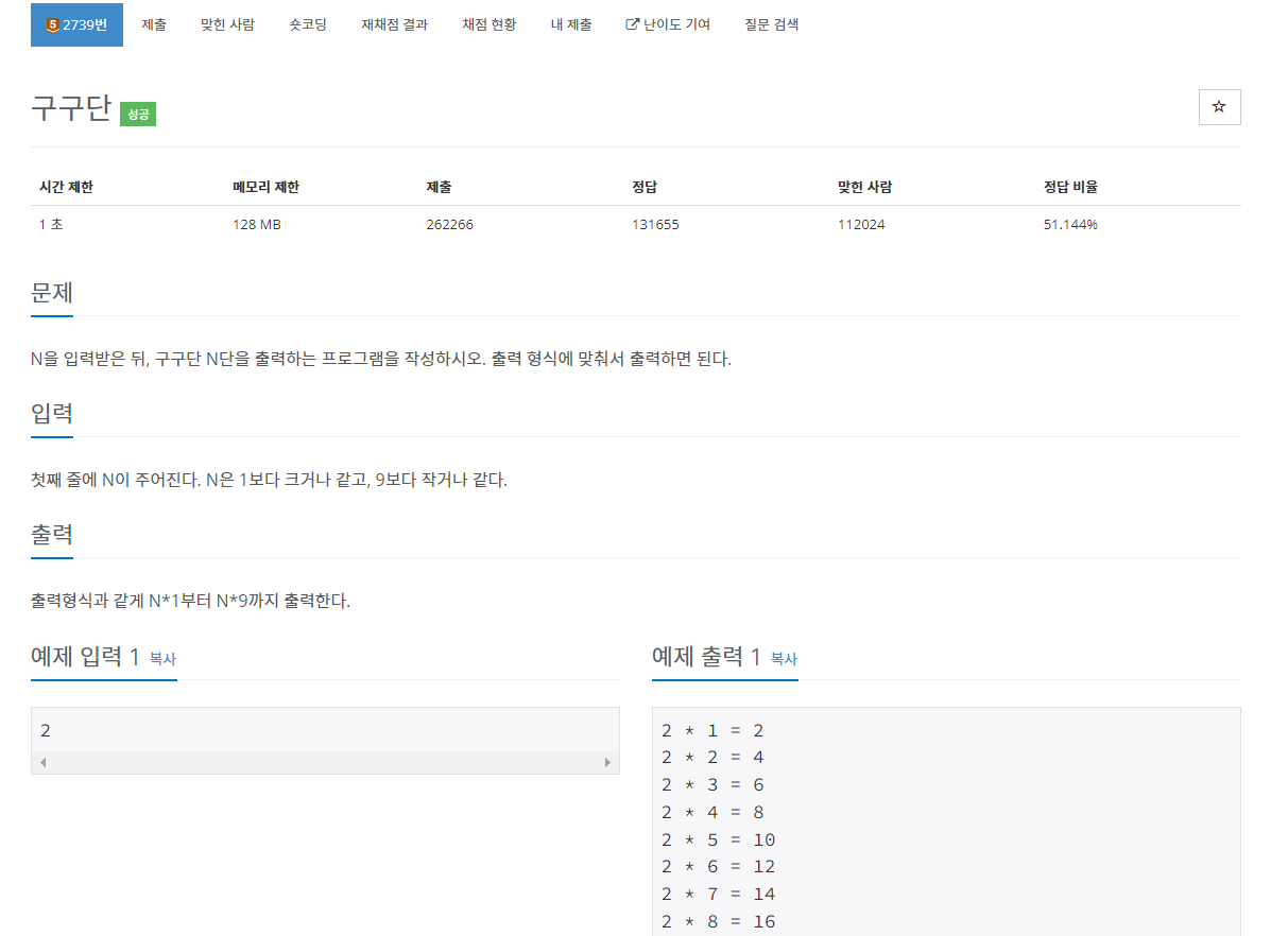 백준 2739번 구구단은 브론즈 5 난이도의 수학 및 구현 문제이다. 이 문제에서는 한 개의 수 N이 주어진다. 그리고 구구단처럼 N * 1부터 N * 9를 차례대로 출력만 해주면 된다.