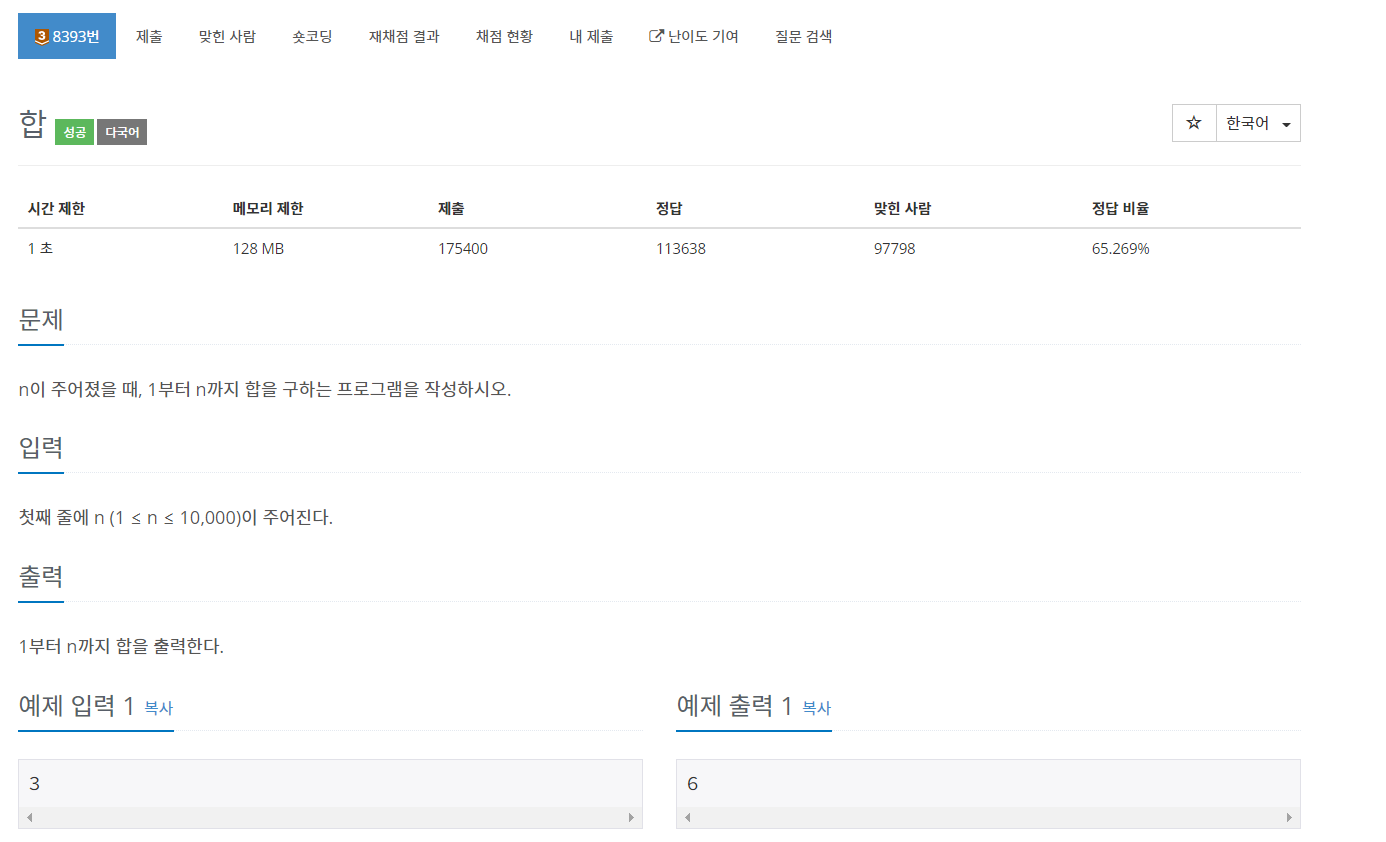 백준 8393번 합은 브론즈 3 난이도의 수학 및 구현 문제이다. 이 문제에서는 숫자 n이 주어지고 1부터 n까지의 합을 출력만 해주면 된다.