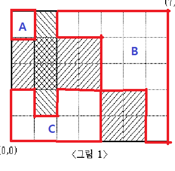 예제를 보면 다음과 같이 3개의 영역이 나온다. 그리고 A의 넓이는 1, B의 넓이는 13, C의 넓이는 7이다.