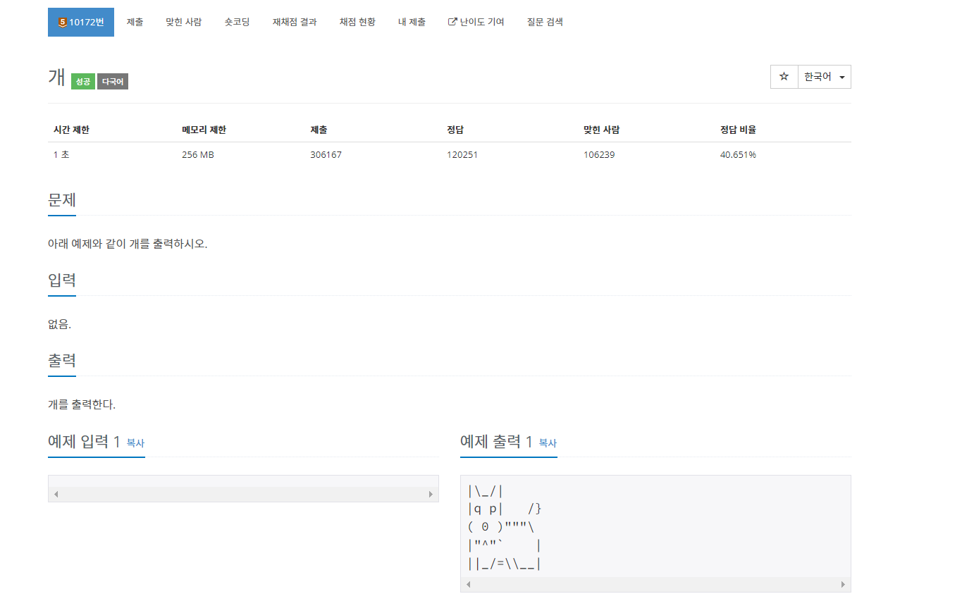 백준 10172번 개는 브론즈 5 난이도의 구현 문제이다. 이 문제는 백준 10171번 고양이와 매우 흡사한 문제이다.