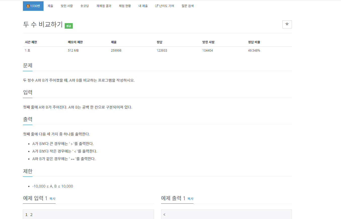 백준 1330번 두 수 비교하기는 브론즈 5 난이도의 구현 문제이다. 이 문제에서는 두 수 A B가 주어진다. 그리고 A가 B보다 크면 '>'를, A가 B보다 작으면 '<'를, 그리고 같으면 '=='를 출력해주면 된다.