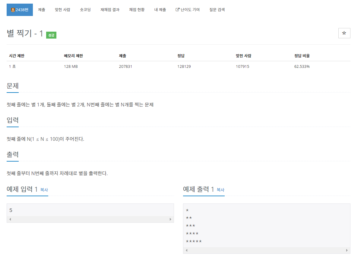 백준 2438번 별 찍기 - 1는 브론즈 5 난이도의 구현 문제이다. 이 문제에서는 첫째 줄부터 N번째 줄까지 차례대로 별(*)을 출력하면 되는 문제이다. 첫째 줄에는 * 1개, 둘째 줄에는 * 2개, 그리고 N번째 줄에는 *N개를 출력하면 되는 간단한 문제이다.