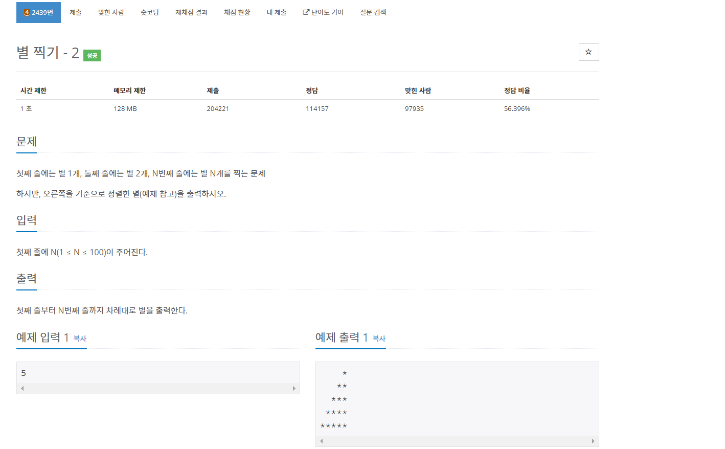 백준 2439번 별 찍기 - 2는 브론즈 4 난이도의 구현 문제이다. 이 문제도 전에 풀었던 별 찍기 문제와 상당히 비슷한 문제이다. 이 문제도 첫째 줄부터 N번째 줄까지 차례대로 별을 출력하는 문제이다. 하지만, 이전 문제와 다른 점은 별이 오른쪽 기준으로 있다는 것이다.
