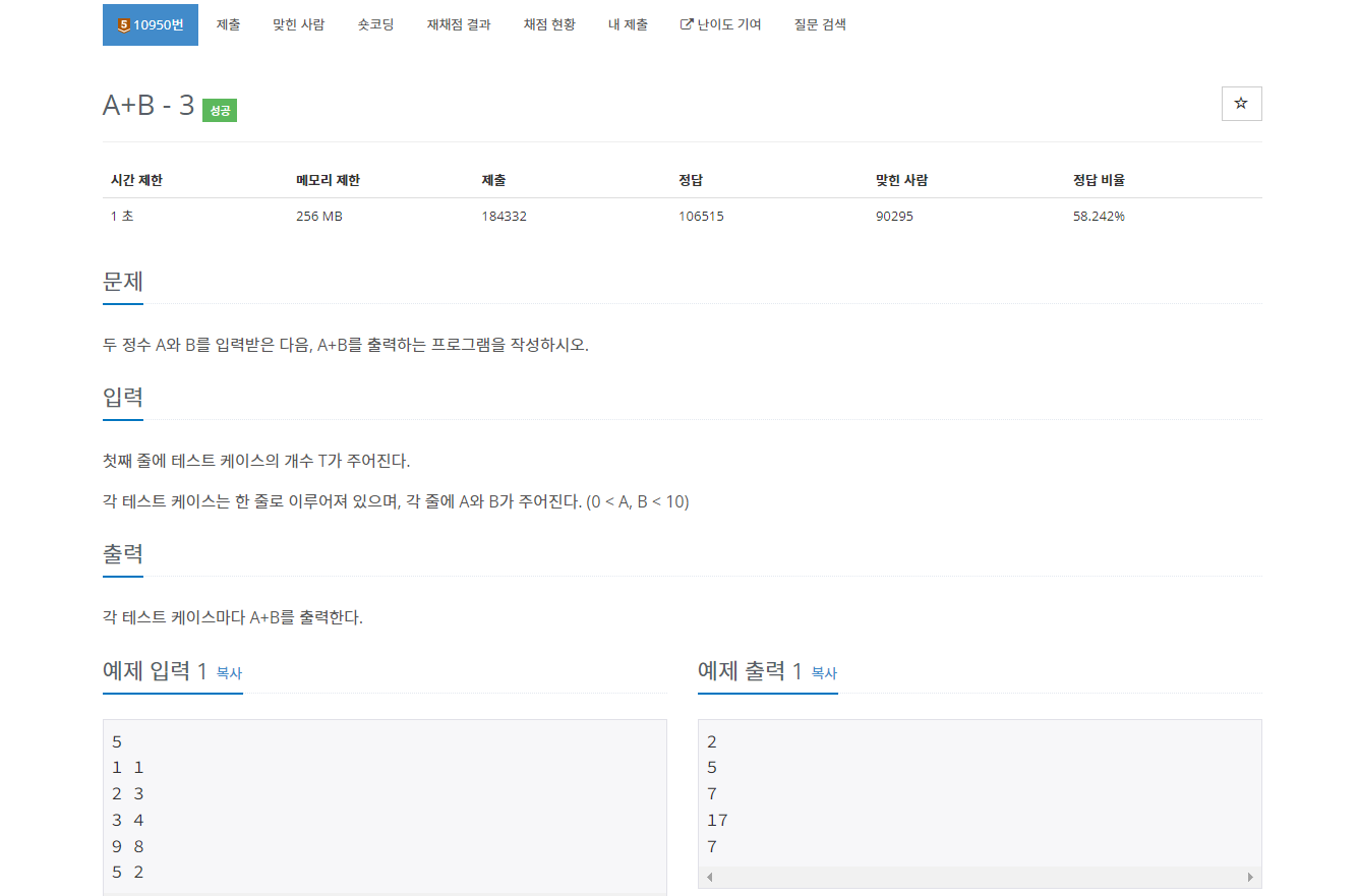 백준 10950번 A+B - 3은 브론즈 5 난이도의 수학 및 구현 문제이다. 이 문제에서는 우선 테스트 케이스의 개수 T가 주어진다. 그리고 그다음에 T개의 A와 B가 주어지고 A+B의 값을 출력하면 된다.