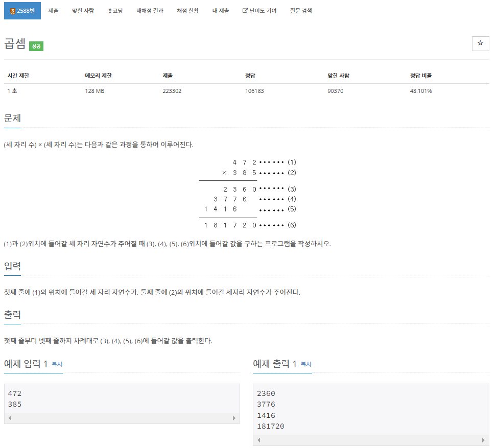 백준 2588번 곱셈은 브론즈 3 난이도의 수학 문제이다. 이 문제에서는 2개의 세 자리 수 a와 b가 주어진다. 그리고 a × b의 1의 자리 수, a × b의 10의 자리 수, a × b의 100의 자리 수, 그리고 마지막으로 a × b의 값을 출력하면 된다.