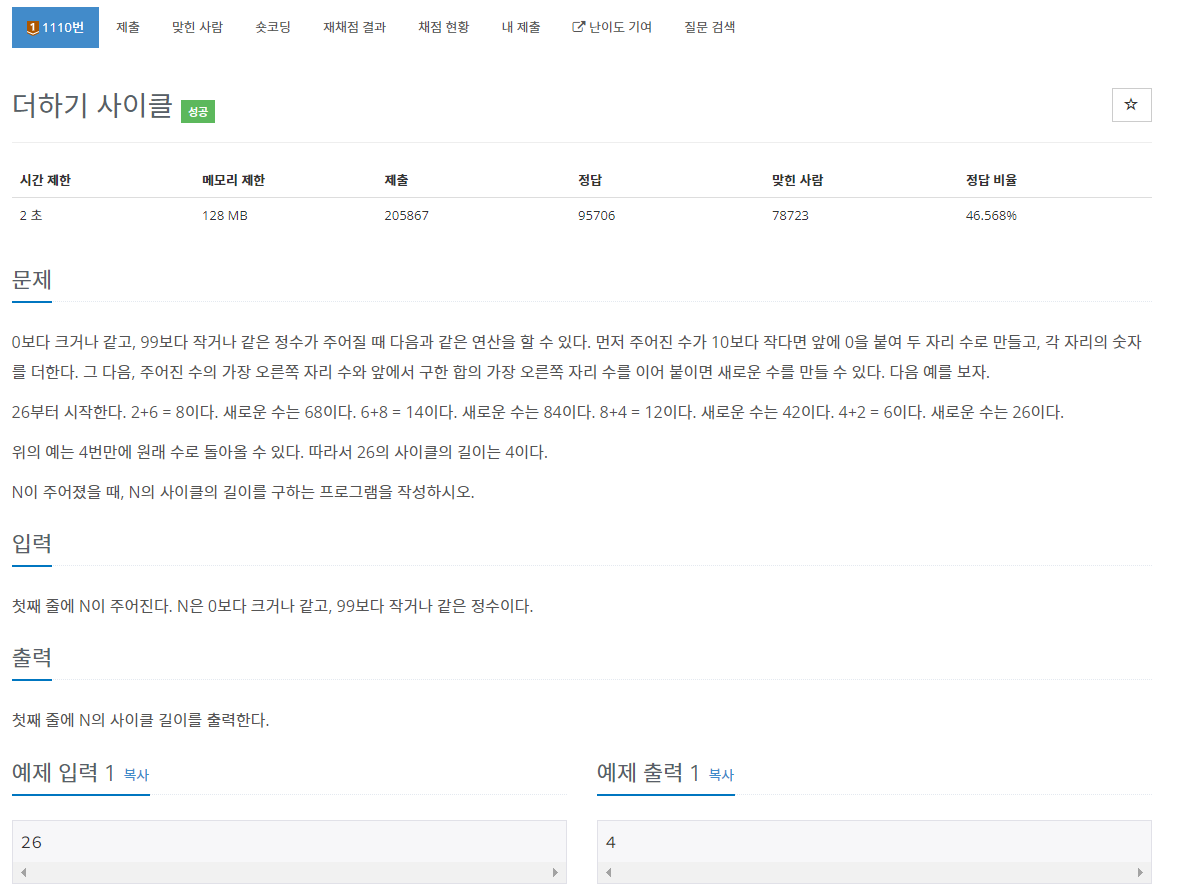 백준 1110번 더하기 사이클은 브론즈 1 난이도의 수학 및 구현 문제이다. 이 문제에서는 0보다 크거나 같고 100보다 작은 정수 n이 주어진다. 그리고 n이 10보다 작으면 앞에 0을 붙여 두 자리 수로 만들고, 각 자리의 숫자를 더한다. 그다음, 주어진 수의 가장 오른쪽 자리 수와 앞에서 구한 합의 가장 오른쪽 자리 수를 이어 붙이면 새로운 수를 만들 수 있다. 그리고 이러한 방법으로 계속해서 새로운 수를 만들 때, 몇 번을 거쳐야 원래 수로 돌아오는지를 출력하면 되는 문제이다.
