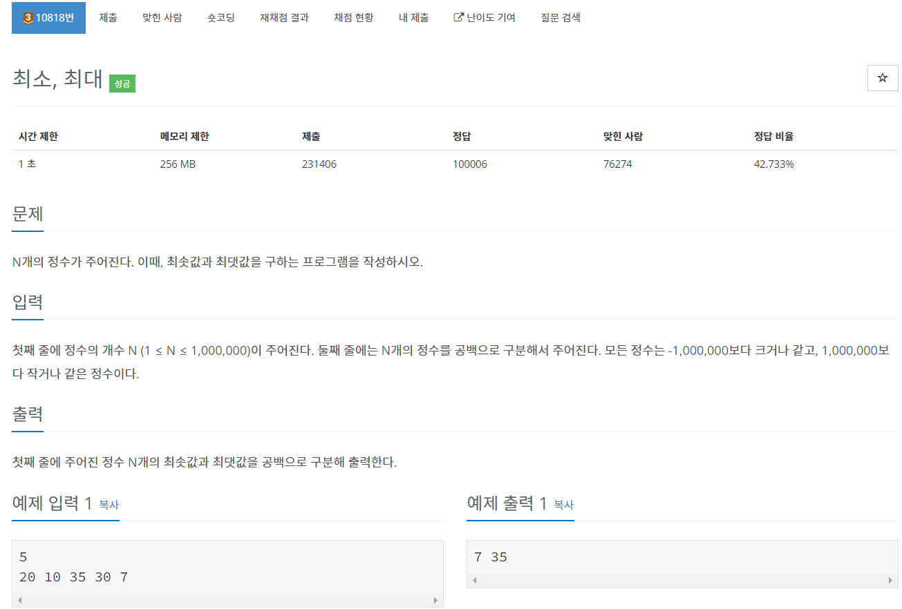 백준 10818번 최소, 최대는 브론즈 3 난이도의 수학 및 구현 문제이다. 이 문제에서는 n개의 정수가 주어지고 그 정수들 중에서 최솟값과 최댓값을 출력하면 되는 문제이다.