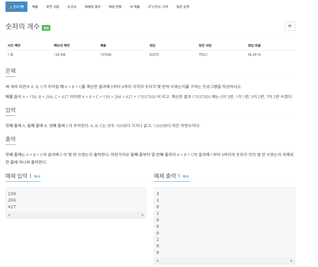 백준 2577번 숫자의 개수는 브론즈 2 난이도의 수학 및 구현 문제이다. 이 문제에서는 3개의 세 자릿수 A, B, 그리고 C가 주어진다. 그리고 A × B × C의 값에서 0부터 9까지 각각의 숫자가 몇 번씩 있는지를 출력하면 된다.