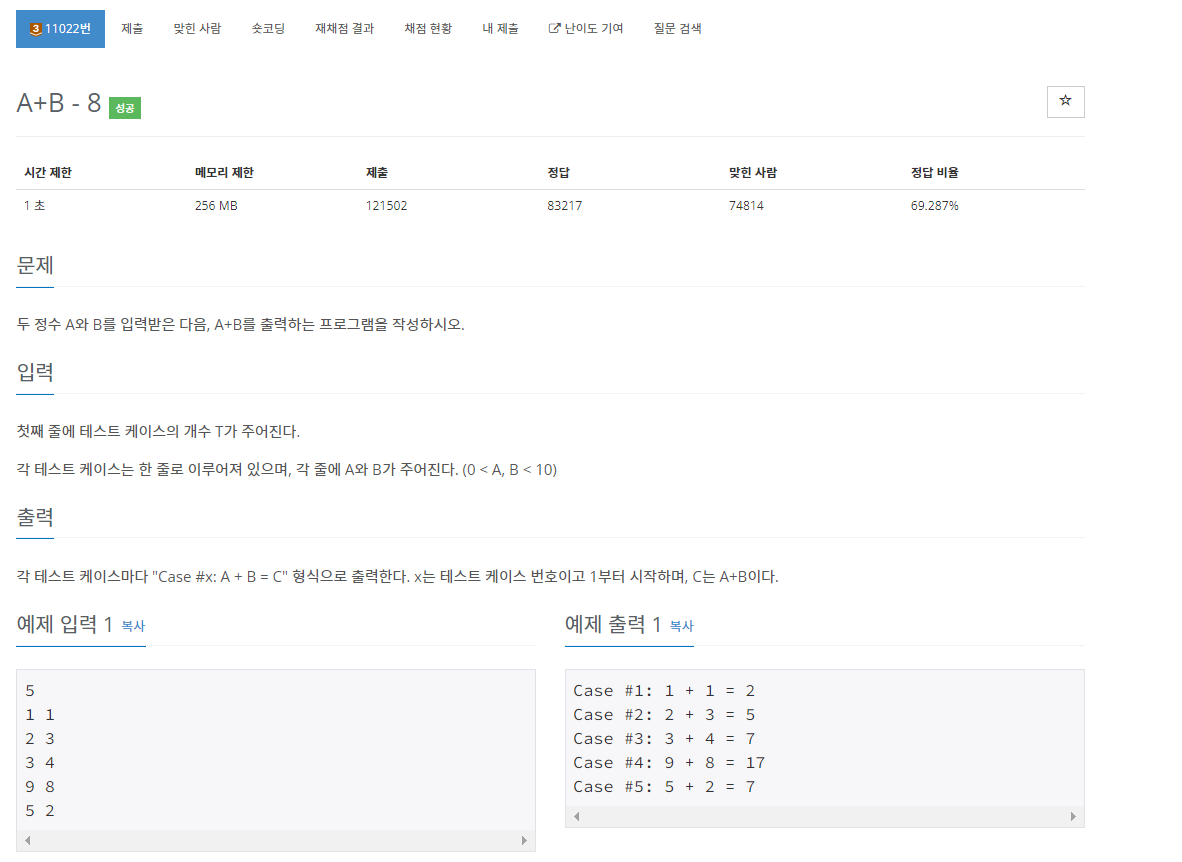 백준 11022번 A+B - 8는 브론즈 3 난이도의 수학 및 구현 문제이다. 이 문제에서는 먼저 테스트 케이스의 개수 T가 주어진다. 그리고 각 테스트 케이스에서는 A와 B가 주어진다. 그리고 각 테스트 케이스마다 "Case #x: A + B = C"의 형식으로 답을 출력하면 된다.