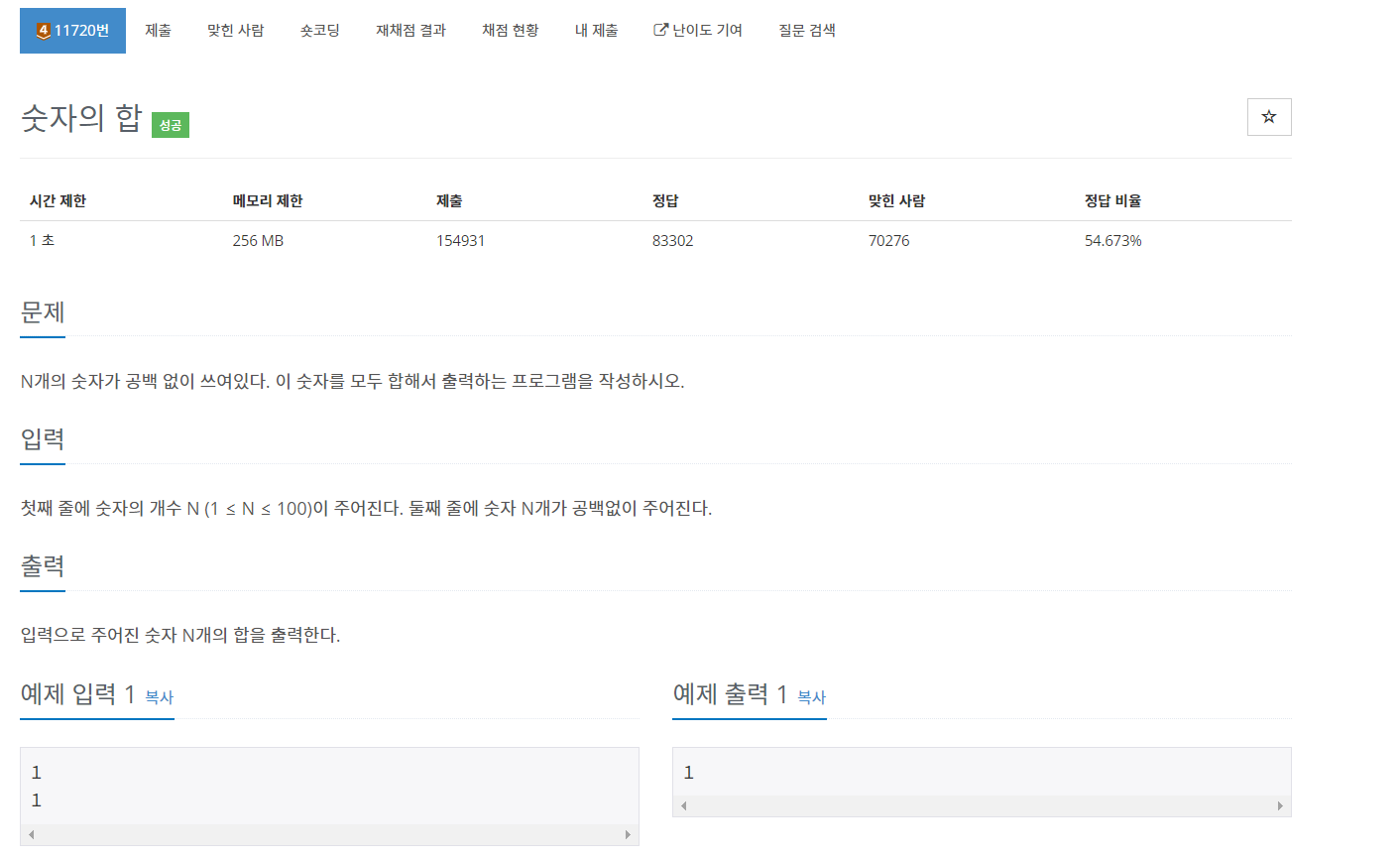 백준 11720번 숫자의 합은 브론즈 4 난이도의 수학, 구현, 그리고 문자열 문제이다. 이 문제에서는 먼저 숫자의 개수 N이 주어지고 그다음 줄에 숫자 N개가 공백 없이 주어진다. 그리고 이 N개의 숫자의 합을 출력하면 되는 문제이다.