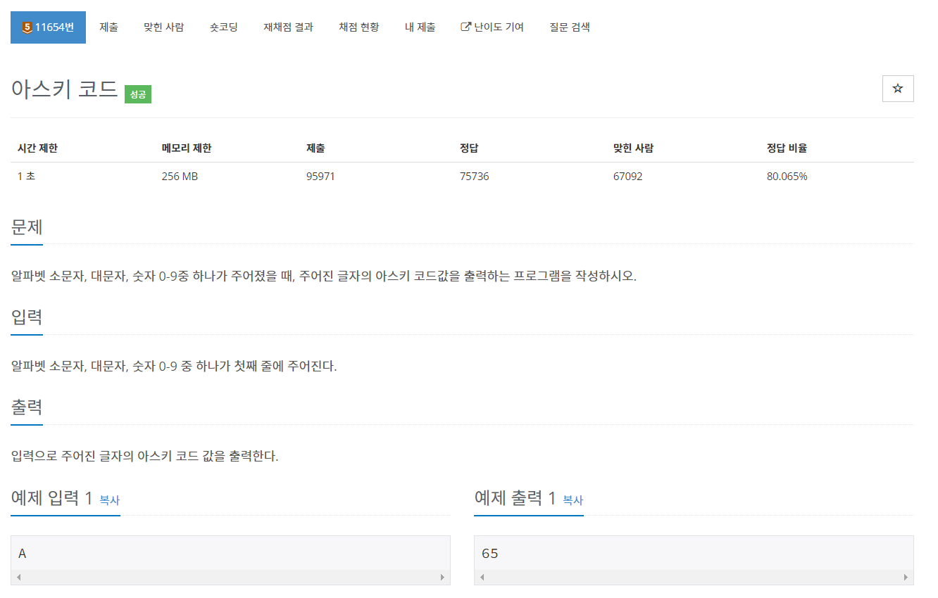 백준 11654번 아스키 코드는 브론즈 5 난이도의 구현 문제이다. 이 문제에서는 입력으로 주어지는 알파벳 또는 수사가 하나 주어졌을 때, 이 주어진 글자를 아스키 코드값으로 출력하면 되는 문제이다.