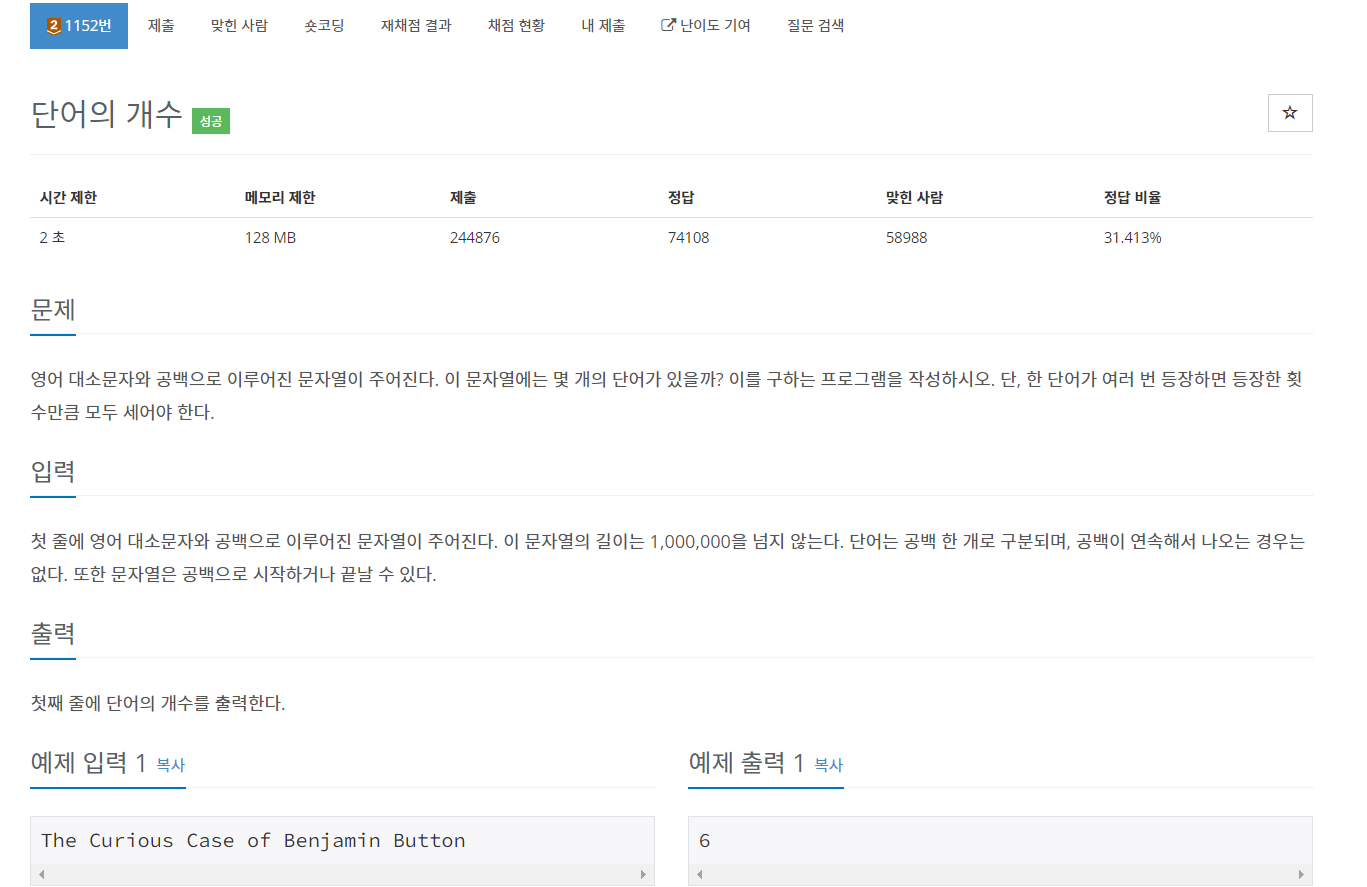 백준 1152번 단어의 개수는 브론즈 2 난이도의 구현 및 문자열 문제이다. 이 문제에서는 한 줄로 공백으로 이루어진 문자열이 하나 주어진다. 그리고 이 문자열은 무조건 공백 하나로 이루어져 있다. 이때 이 문자열에 단어가 몇 개 있는지를 출력하면 된다.