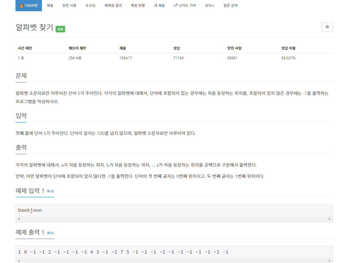 백준 10809번 알파벳 찾기는 브론즈 5 난이도의 구현 및 문자열 문제이다. 이 문제에서는 소문자로만 이루어진 문자열 1개가 주어진다. 그리고 각각의 알파벳이 처음 등장하는 위치를 출력하면 된다. 단, 한 알파벳이 등장하지 않으면 -1로 출력을 하면 되는 문제이다.