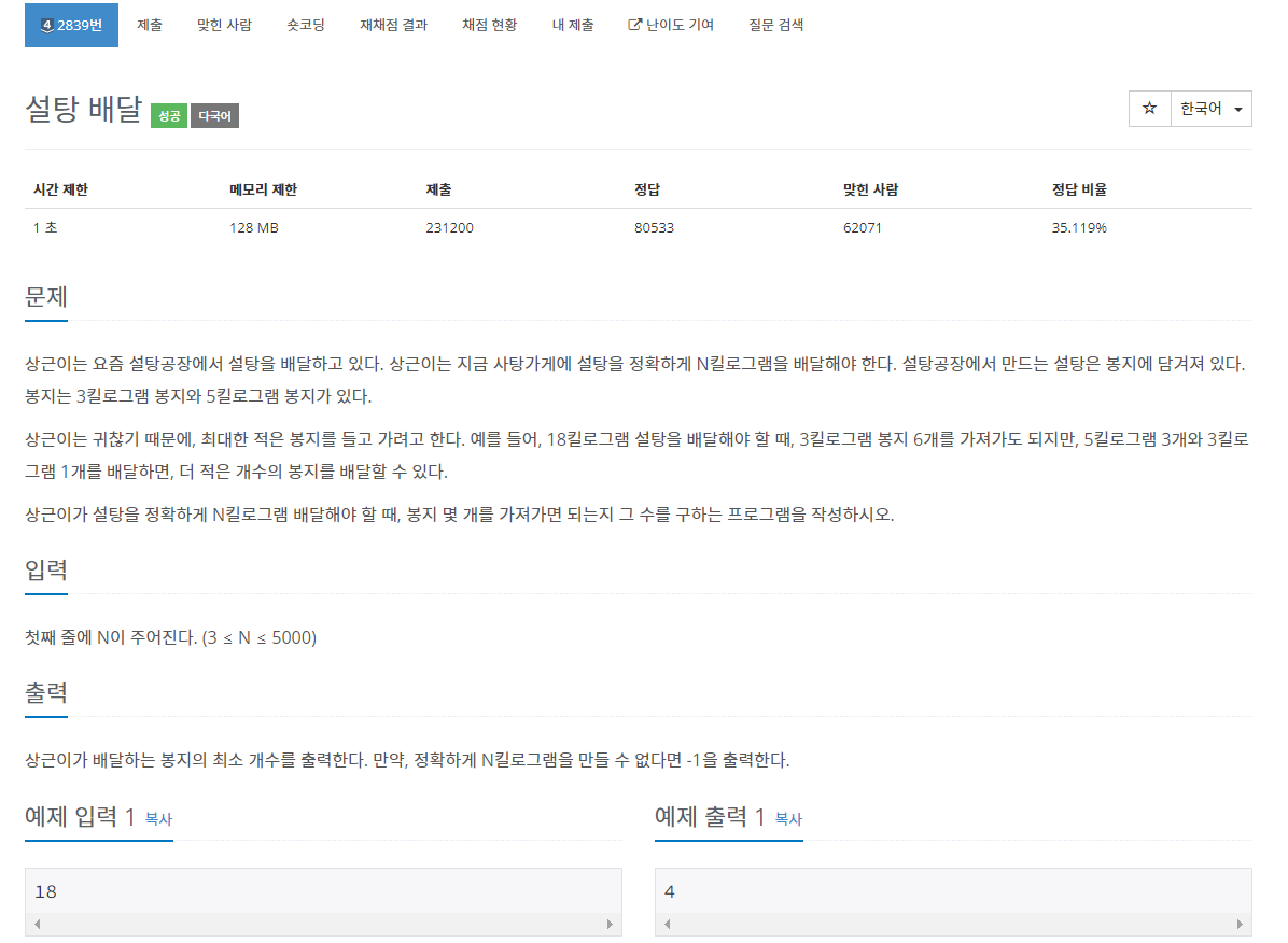 백준 2839번 설탕 배달은 실버 4 난이도의 수학, DP 그리고 그리디 문제이다. 이 문제에서는 설탕 무게 N이 주어진다. 그리고 설탕 봉지는 3 킬로그램 봉지와 5 킬로그램 봉지만 있다. 이때 최대한 적은 봉지를 사용해서 무게 N을 맞혀야 한다.