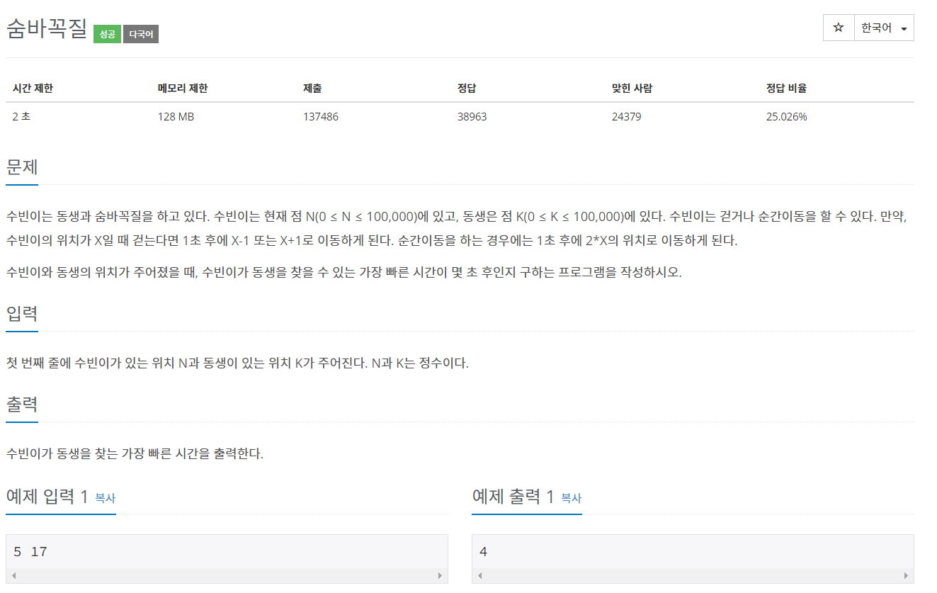 수빈이는 동생과 숨바꼭질을 하고 있다. 수빈이는 현재 점 N(0 ≤ N ≤ 100,000)에 있고, 동생은 점 K(0 ≤ K ≤ 100,000)에 있다. 수빈이는 걷거나 순간이동을 할 수 있다. 만약, 수빈이의 위치가 X일