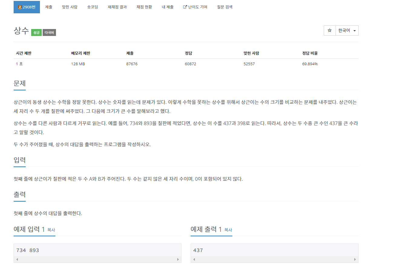 백준 2908번 상수는 브론즈 2 난이도의 수학 및 구현 문제이다. 이 문제에서는 입력으로 두 정수가 주어진다. 그리고 두 정수를 거꾸로 읽었을 때 더 큰 수가 어떤 수인지 출력하면 되는 문제이다.