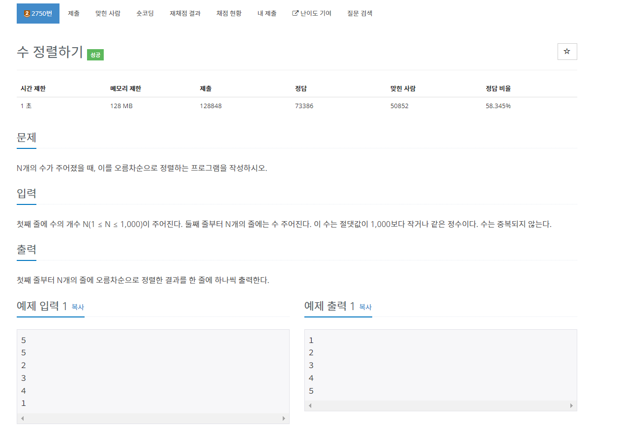 백준 2750번 수 정렬하기는 브론즈 2 난이도의 구현 및 정렬 문제이다. 이 문제에서는 N개의 수가 주어지고 이 N개의 수들을 오름차순으로 정렬하면 되는 문제이다.