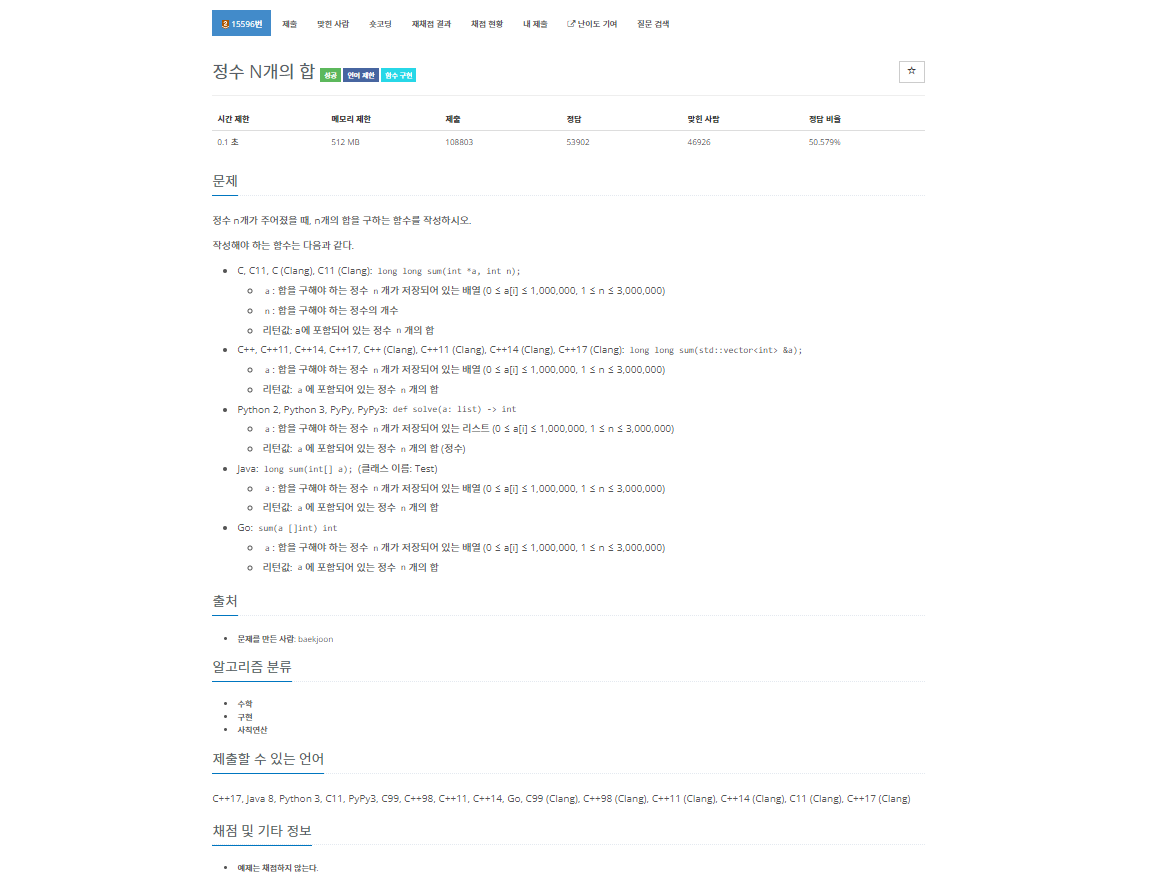백준 15596번 정수 N개의 합은 브론즈 2 난이도의 수학 및 구현 문제이다. 그리고 이 문제가 다른 문제들과 비교했을 때 조금 다른 점은 함수를 직접 구현해야 하는 것이다. '제출'을 눌러보면 다음과 같이 나와있다는 것을 알 수 있다.