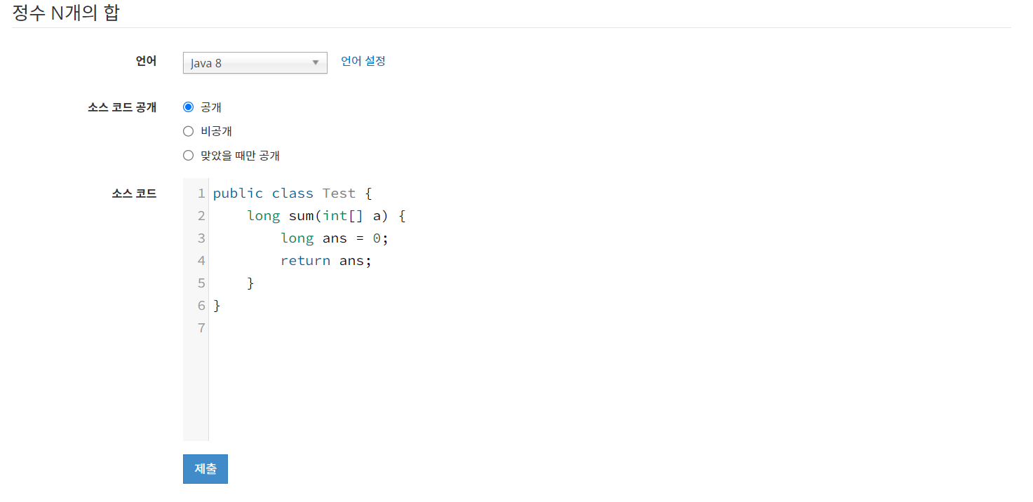 즉, 전처럼 클래스를 직접 만드는 게 아니라 여기 나와있는 클래스에 sum 메서드만 구현만 하면 되는 것이다. 문제 자체는 어렵지 않다. int형 배열 a가 주어지고 이 배열에 있는 모든 수들을 long형 변수 ans에 더해서 ans를 반환만 하면 되는 문제이다.