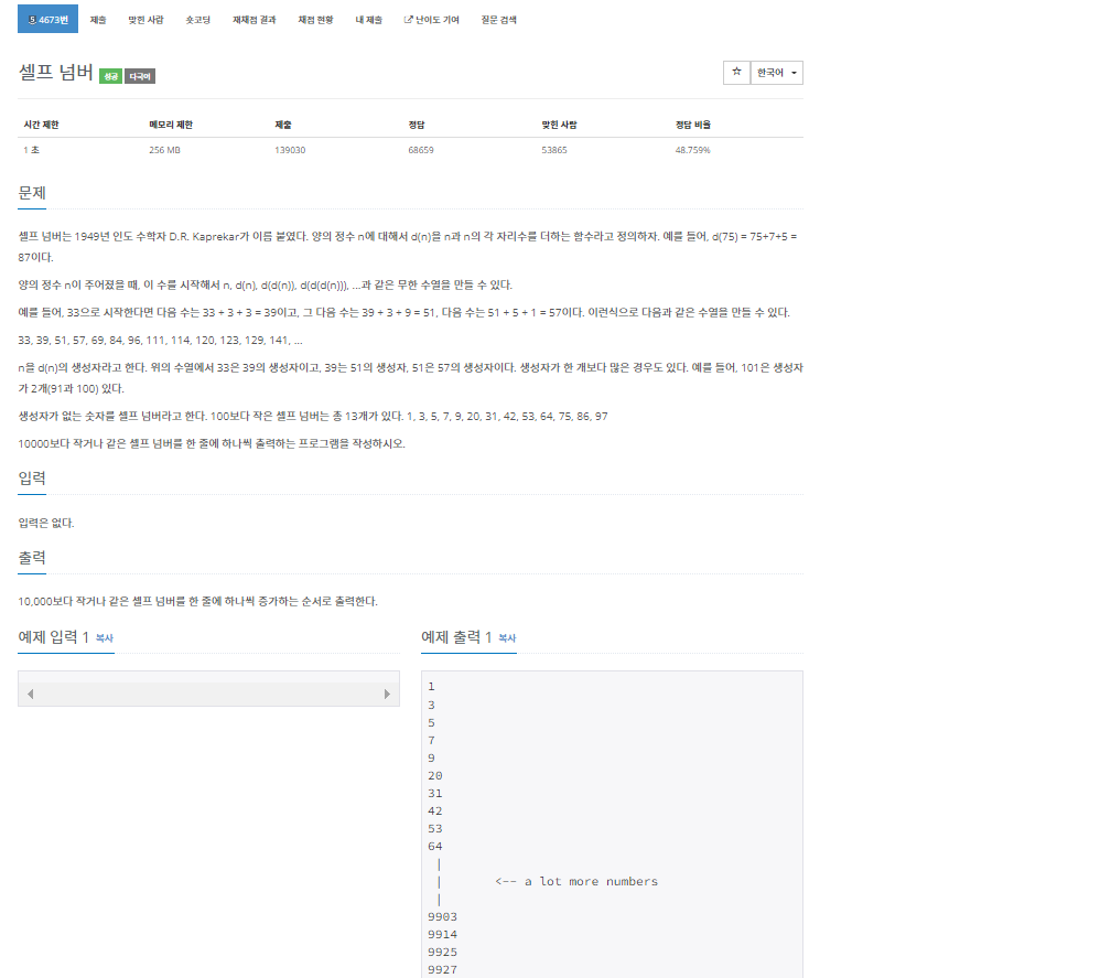 백준 4673번 셀프 넘버는 실버 5 난이도의 수학, 구현 및 브루트 포스 문제이다. 이 문제에서는 함수 d(n)이 있다. d(n)은 n과 n의 각 자릿수를 더하는 함수이다. 그리고 n을 d(n)의 생성자라고 한다. 그리고 생성자가 없는 수를 셀프 넘버라고 한다. 이 문제에서는 10000보다 작거나 같은 셀프 넘버들을 전부 출력하면 된다.