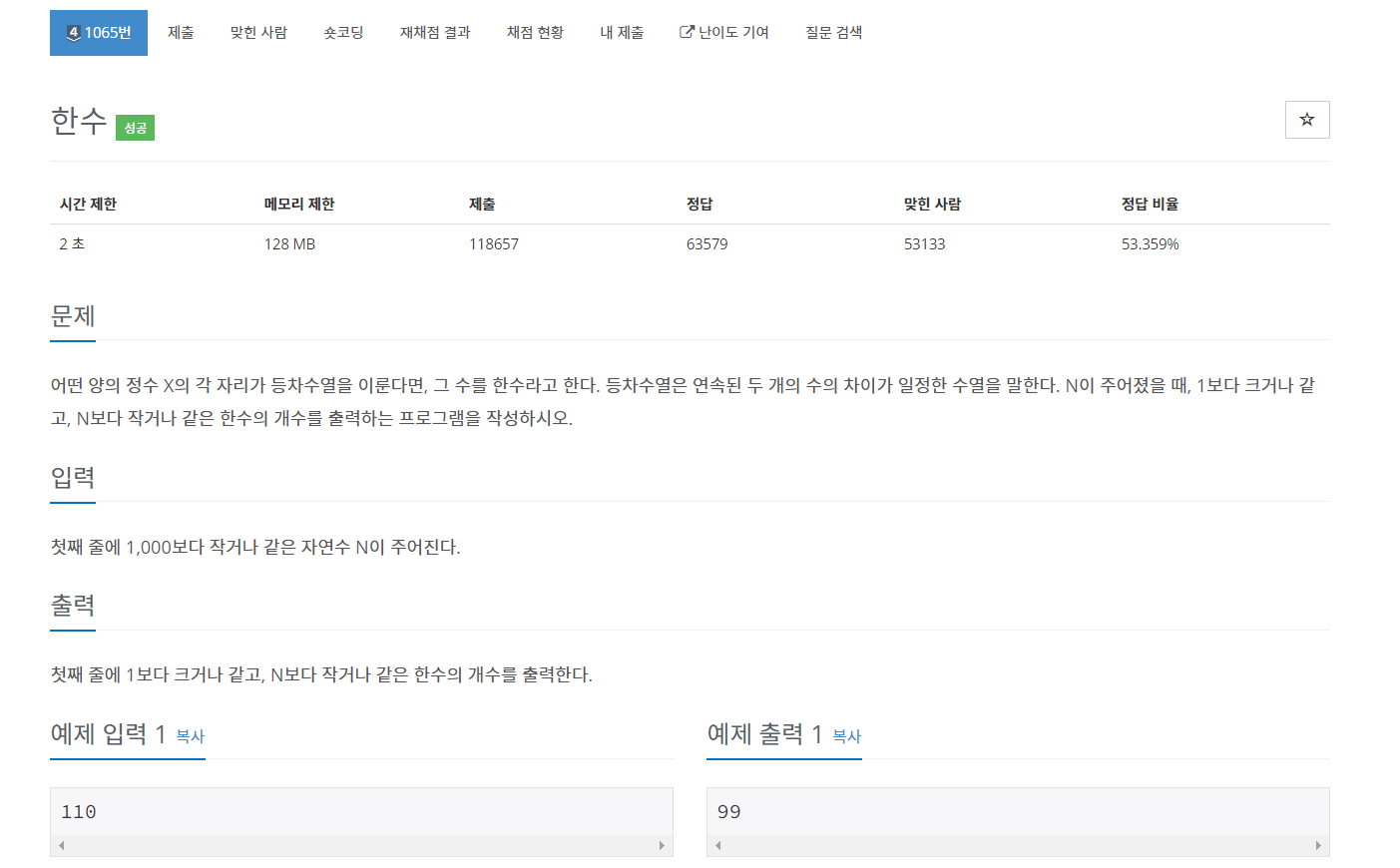 백준 1065번 한수는 실버 4 난이도의 브루트 포스 문제이다. 만약에 자연수 N의 각 자리가 등차수열을 이루면, 이 N을 한수라고 한다. 이 문제에서는 자연수 N이 주어진다. 그리고 N보다 작거나 같은 한수의 개수를 출력하면 되는 문제이다.