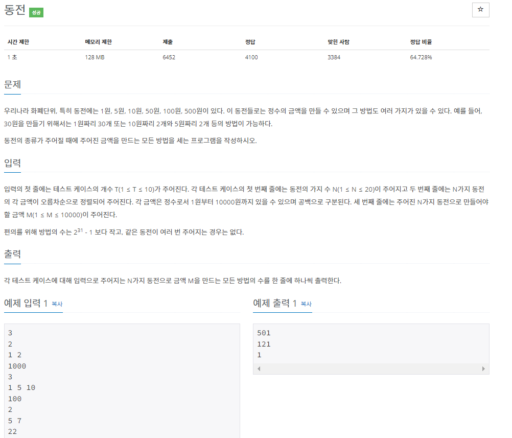 https://www.acmicpc.net/problem/2293 2293번: 동전 1 첫째 줄에 n, k가 주어진다. (1 ≤ n ≤ 100, 1 ≤ k ≤ 10,000) 다음 n개의 줄에는 각각의 동전의 가치가 주어진다. 동전의 가치는 100,000보다 작거나 같..