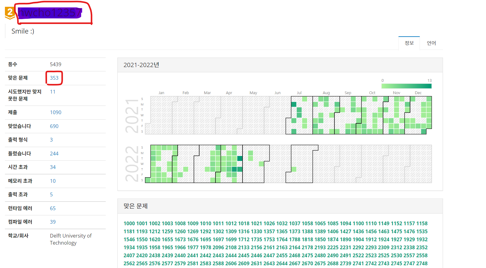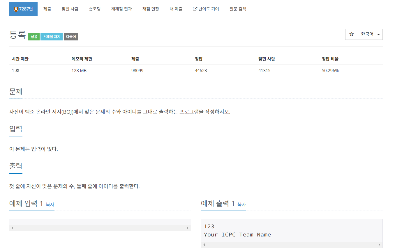 백준 7287번 등록은 브론즈 5 난이도의 구현 문제이다. 이 문제는 조금 특별한 문제이다. 자신이 백준에서 맞은 문제 수와 아이디를 출력하면 되는 문제이다.