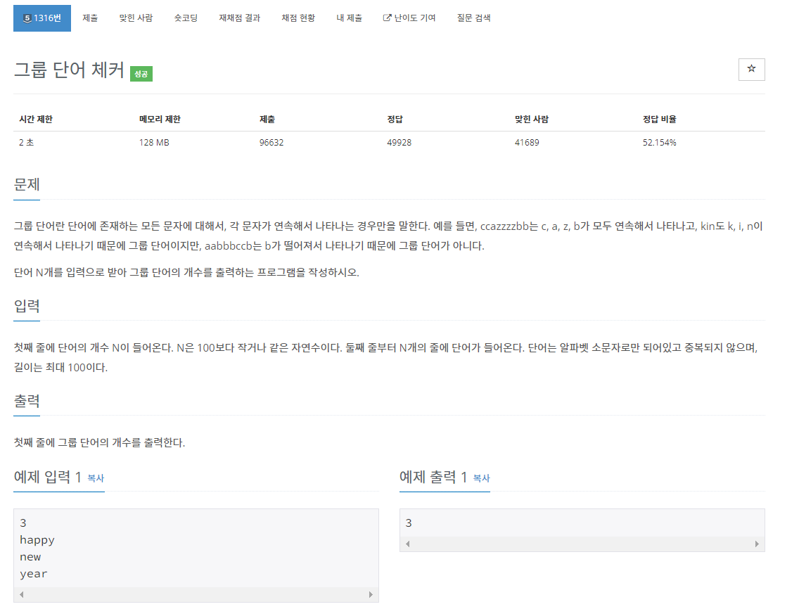 백준 1316번 그룹 단어 체커는 실버 5 난이도의 구현 및 문자열 문제이다. 이 문제에서는 N개의 단어가 주어진다. 그리고 이 N개 단어들 중에서 그룹 단어가 몇 개인지를 출력해주면 된다. 그리고 그룹 단어는 단어에 있는 모든 문자가 연속해서 나타날 때 그룹 단어라고 한다.