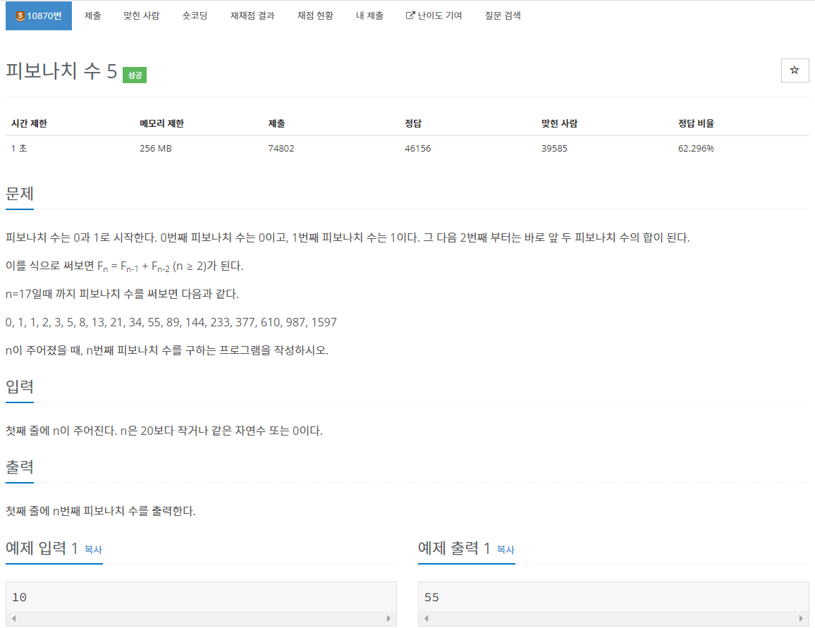 우선 이 문제는 20 이하인 정수 N이 주어지고 이 N이 주어졌을 때 N번째 피보나치 값을 출력하면 된다. n번째 피보나치 공식은 다음과 같다.