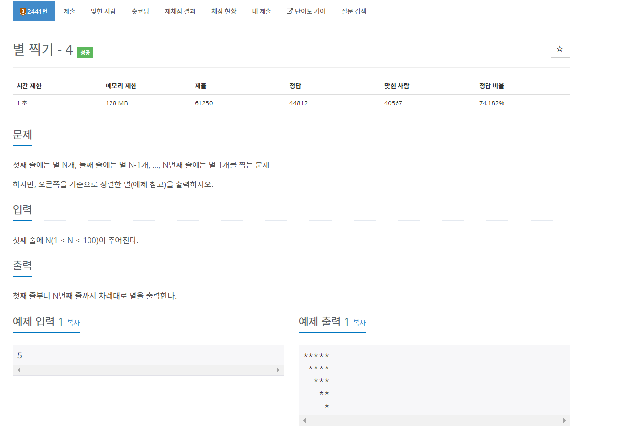 백준 2441번 별 찍기 - 4는 브론즈 3 난이도의 구현 문제이다. 이 문제에서는 자연수 N이 주어진다. 그리고 첫째 줄에는 별 N개, 둘째 줄에는 N - 1개, 그리고 마지막 줄에는 별 1개를 출력하면 된다. 단, 별들은 오른쪽을 기준으로 정렬된 상태로 출력하면 되는 문제이다.