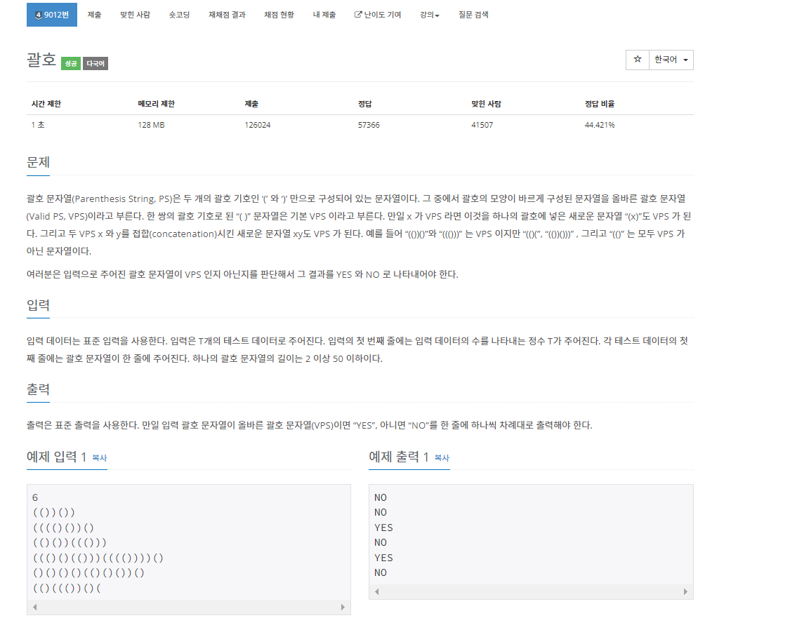 백준 9012번 괄호는 실버 4 난이도의 자료 구조, 문자열 및 스택 문제이다. 이 문제에서는 T개의 테스트 케이스가 있다. 그리고 각 테스트 케이스에서는 괄호 문자열이 1개 주어진다. 이때 이 괄호 문자열이 올바른 괄호 문자열이면 YES, 아니면 NO를 출력하면 되는 문제이다.