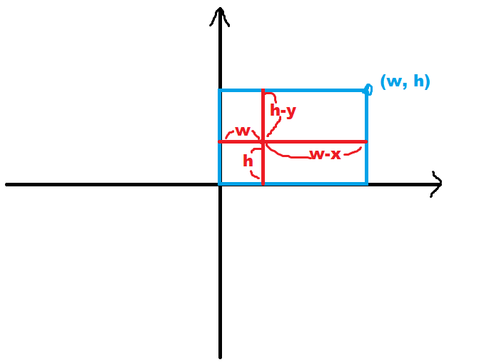 이 거리들은 그림에 나와있는 것처럼 w, h, h - y, w - x이다. 따라서 이 값들의 최솟값을 출력하기만 하면 되는 문제이다.